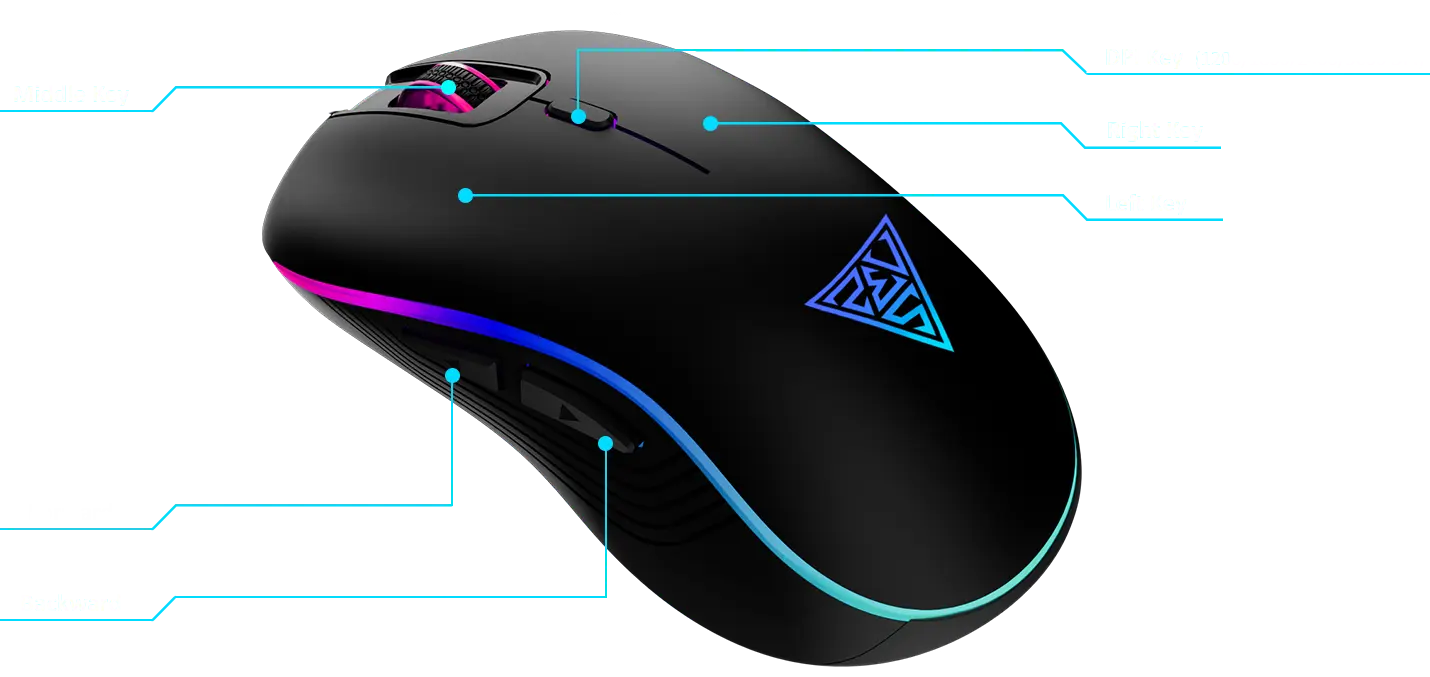 The captivating 7-color cycle of breathing RGB lighting effects enhances the gaming experience by illuminating the palm and fingertips. The LED backlight can be conveniently deactivated by pressing the DPI key for a few seconds.